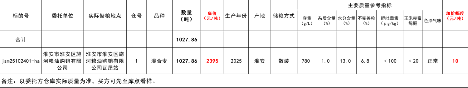 買賣雙方自主交收(雙方自行承擔(dān)資金安全責(zé)任,自行采取有效措施防范交割風(fēng)險(xiǎn)),中標(biāo)方憑合同、身份證明、貨款到賬憑證到委托方提貨,交割完成后買賣雙方憑雙方確認(rèn)單到交易市場(chǎng)退保證金(保證金待合同履約結(jié)束后統(tǒng)一釋放)。交款期、交割期為2025年10月24日—2025年11月5日。標(biāo)書各項(xiàng)質(zhì)量指標(biāo)由委托單位提供,僅供參考,質(zhì)量以倉庫大樣為準(zhǔn),買方一旦成交,不得提出異議。交割數(shù)量以倉內(nèi)實(shí)際數(shù)量為準(zhǔn),如出現(xiàn)溢余,溢余部分買方必須按標(biāo)的成交價(jià)同價(jià)提清,相應(yīng)貨款由買方直接支付到賣方指定賬戶。因開倉后不能按時(shí)提貨導(dǎo)致的糧食品質(zhì)下降由買方自行承擔(dān)。