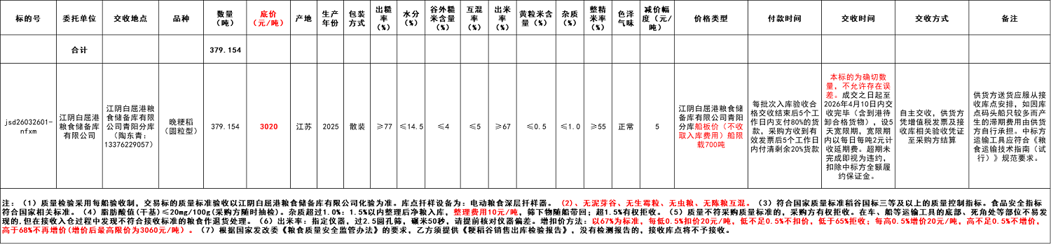 4.交收事項(xiàng):詳見交易清單。******有限公司化驗(yàn)為準(zhǔn)。庫(kù)點(diǎn)扦樣設(shè)備為:電動(dòng)糧食深層扦樣器。 (2)、無(wú)泥芽谷、無(wú)生霉粒、無(wú)蟲糧、無(wú)陳糧互混。(3)符合國(guó)家質(zhì)量標(biāo)準(zhǔn)稻谷國(guó)標(biāo)三等及以上的質(zhì)量控制指標(biāo)。食品安全指標(biāo)符合國(guó)家相關(guān)標(biāo)準(zhǔn)。(4)脂肪酸值(干基)≤20mg/100g(采購(gòu)方隨時(shí)抽檢)。雜質(zhì)超過(guò)1.0%:1.5%以內(nèi)整理后凈糧入庫(kù),整理費(fèi)用10元/噸,篩下物隨船帶回;超1.5%有權(quán)拒收。(5)質(zhì)量不符采購(gòu)質(zhì)量標(biāo)準(zhǔn)的,采購(gòu)方有權(quán)拒收。在車、船等運(yùn)輸工具的底部、死角處等部位不易發(fā)現(xiàn)的,但在接收入倉(cāng)過(guò)程中發(fā)現(xiàn)不符合接收標(biāo)準(zhǔn)的糧食作退貨處理。(6)出米率:指定儀器,過(guò)2.5圓孔篩,碾米50秒,請(qǐng)?zhí)崆昂藢?duì)儀器偏差。增扣價(jià)方法:以67%為標(biāo)準(zhǔn),每低0.5%扣價(jià)20元/噸,低不足0.5%不扣價(jià),低于65%拒收;每高0.5%增價(jià)20元******發(fā)改委《糧食質(zhì)量安全監(jiān)管辦法》的要求,乙方須提供《粳稻谷銷售出庫(kù)檢驗(yàn)報(bào)告》,沒(méi)有檢測(cè)報(bào)告的,接收庫(kù)點(diǎn)將不予接收。(8)供貨方送貨應(yīng)服從接收庫(kù)點(diǎn)安排,如因庫(kù)點(diǎn)碼頭船只較多而產(chǎn)生的滯期費(fèi)用由供貨方自行承擔(dān)。中標(biāo)方運(yùn)輸工具應(yīng)符合《糧食運(yùn)輸技術(shù)指南(試行)》規(guī)范要求。