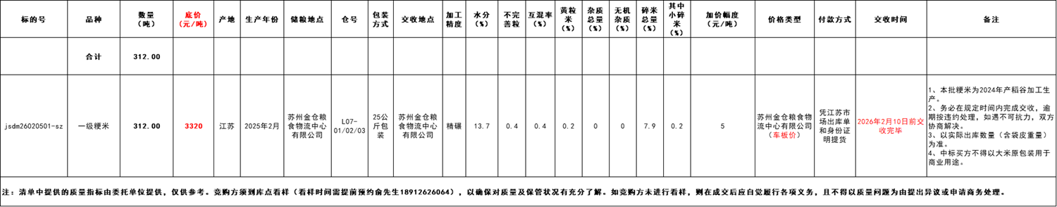 此次競價銷售的標的物為一級粳米(2025年加工)312噸,共1個標段。