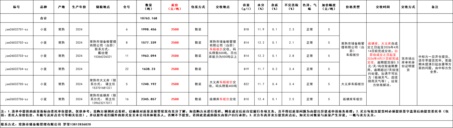 此次競價銷售的標(biāo)的物為2024年常熟產(chǎn)小麥共計10763.168噸,分6個標(biāo)的(詳情見清單)。