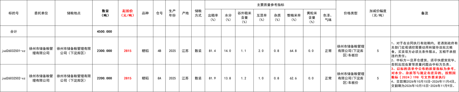 質(zhì)量:以標(biāo)的清單中公布的質(zhì)量指標(biāo)為參考。具體質(zhì)量指標(biāo)依據(jù)第三方檢測(cè)中心檢驗(yàn)報(bào)告為準(zhǔn),對(duì)水分、雜質(zhì)等與規(guī)定有差異的,按照《關(guān)于執(zhí)行糧油質(zhì)量國(guó)家標(biāo)準(zhǔn)有關(guān)問(wèn)題的規(guī)定》(國(guó)糧標(biāo)〔2024〕198號(hào))執(zhí)行。中標(biāo)方須保證輪出粳稻流向符合國(guó)家有關(guān)規(guī)定,并不得用作中央和各級(jí)地方儲(chǔ)備稻谷的輪入,否則一切法律和政策責(zé)任全部由中標(biāo)方自行承擔(dān)。